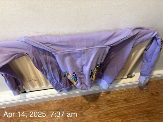 This was previously a very stained white hoody. Thanks to a quick dye job, it's now purple.