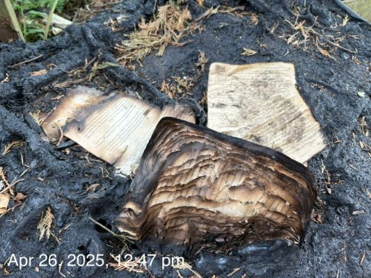 I came across a burned book while out on a walk. I didn't look to see what book it was in case it was something that would give me the spooks.