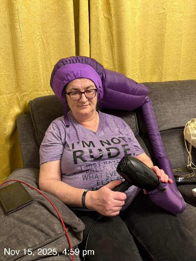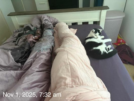 To set the scene: Noirin is wrapped in the purple duvet and I am in the pink weighted blanket. We have adhered quite nicely to a 50/50