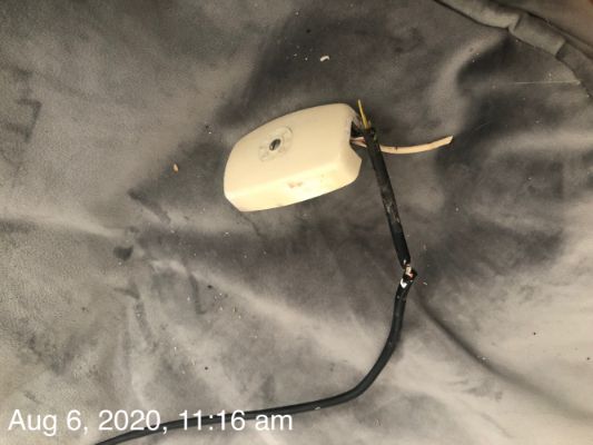 This little box was hanging from a frayed cable in the corner of the bathroom window. When John, who's been doing the work on our