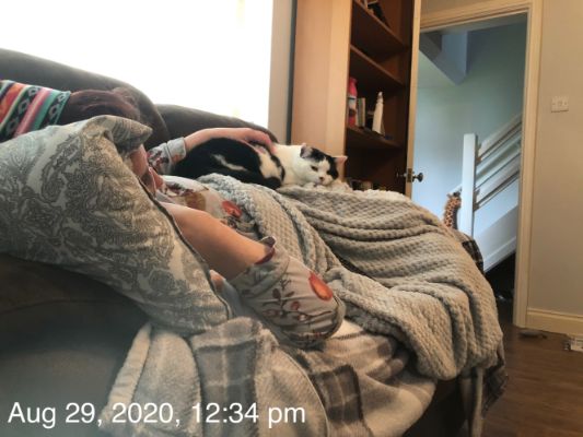 This is normally my default position but today Sally perched on Noirin's side for cuddles. It was super cute.